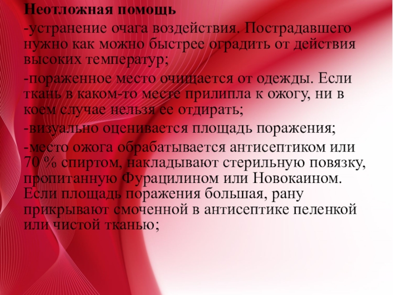 -место ожога обрабатывается антисептиком или 70 % спиртом, накладывают стерильную повязку, пропитанную Фурацилином или Новокаином. Если площадь поражения большая, рану прикрывают смоченной в антисептике пеленкой или чистой тканью;