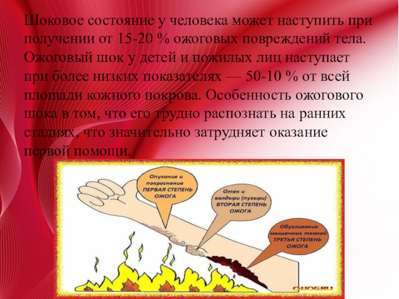 ожоговых повреждений тела. Ожоговый шок у детей и пожилых лиц наступает при более низких показателях — 50-10 % от всей площади кожного покрова. Особенность ожогового шока в том, что его трудно распознать на ранних стадиях, что значительно затрудняет оказание первой помощи.