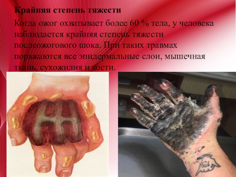 наблюдается крайняя степень тяжести послеожогового шока. При таких травмах поражаются все эпидермальные слои, мышечная ткань, сухожилия и кости.