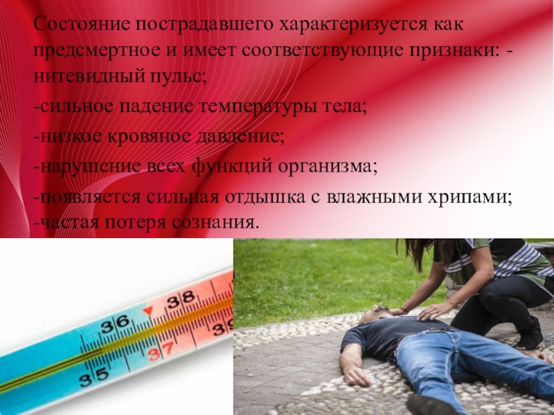 Слайд 11Состояние пострадавшего характеризуется как предсмертное и имеет соответствующие признаки: -нитевидный пульс;