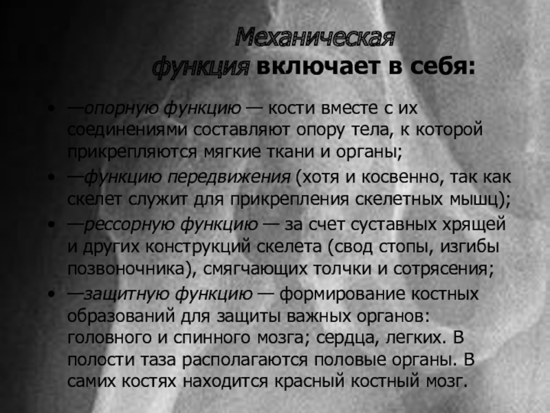 —защитную функцию — формирование костных образований для защиты важных органов: головного и спинного мозга; сердца, легких. В полости таза располагаются половые органы. В самих костях находится красный костный мозг.