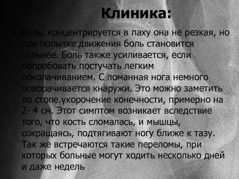 боль становится сильнее. Боль также усиливается, если попробовать постучать легким поколачиванием. С ломанная нога немного поворачивается кнаружи. Это можно заметить по стопе.укорочение конечности, примерно на 2- 4 см. Этот симптом возникает вследствие того, что кость сломалась, и мышцы, сокращаясь, подтягивают ногу ближе к тазу. Так же встречаются такие переломы, при которых больные могут ходить несколько дней и даже недель