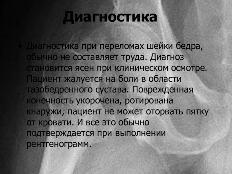 Диагностика при переломах шейки бедра, обычно не составляет труда. Диагноз становится