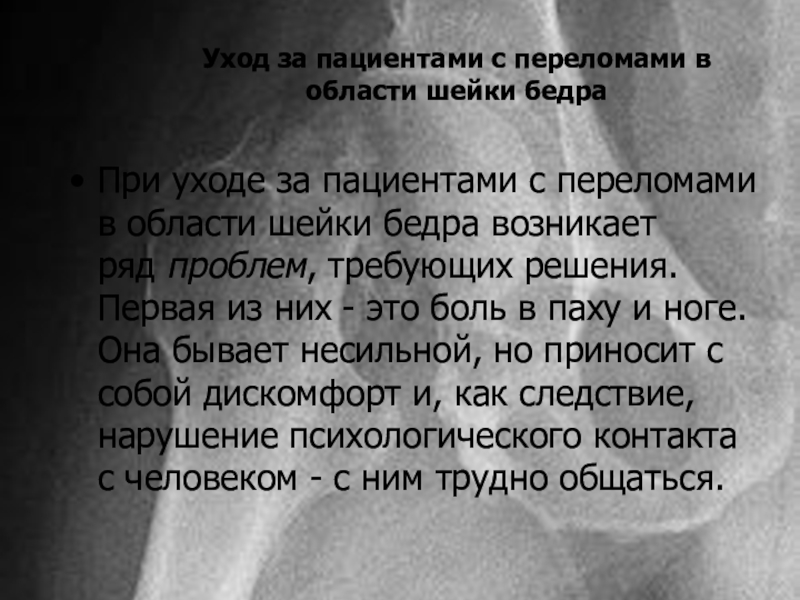 пациентами с переломами в области шейки бедра возникает ряд проблем, требующих решения. Первая из них - это боль в паху и ноге. Она бывает несильной, но приносит с собой дискомфорт и, как следствие, нарушение психологического контакта с человеком - с ним трудно общаться.