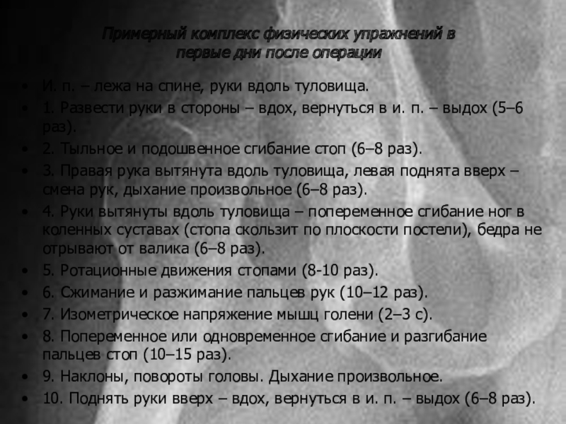 Слайд 18Примерный комплекс физических упражнений в первые дни после операции