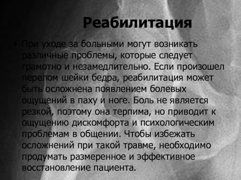 и незамедлительно. Если произошел перелом шейки бедра, реабилитация может быть осложнена появлением болевых ощущений в паху и ноге. Боль не является резкой, поэтому она терпима, но приводит к ощущению дискомфорта и психологическим проблемам в общении. Чтобы избежать осложнений при такой травме, необходимо продумать размеренное и эффективное восстановление пациента.