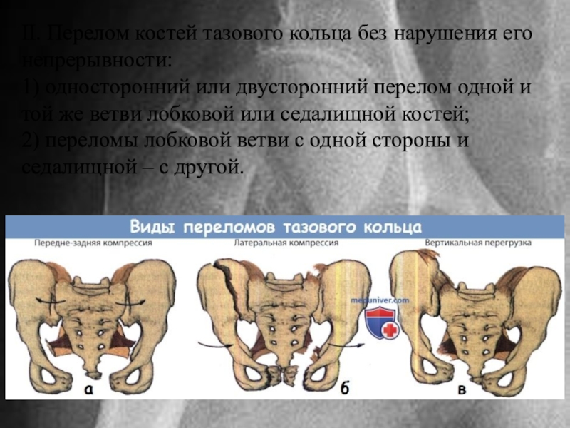 Слайд 7II. Перелом костей тазового кольца без нарушения его непрерывности:
