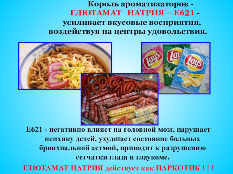 Е621 - негативно влияет на головной мозг, нарушает психику детей, ухудшает состояние больных бронхиальной астмой, приводит к разрушению сетчатки глаза и глаукоме.