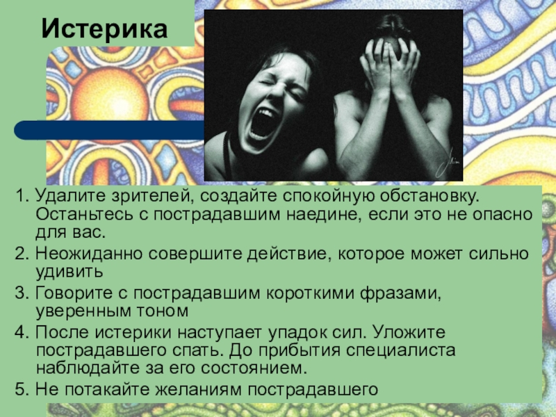 4. После истерики наступает упадок сил. Уложите пострадавшего спать. До прибытия специалиста наблюдайте за его состоянием.