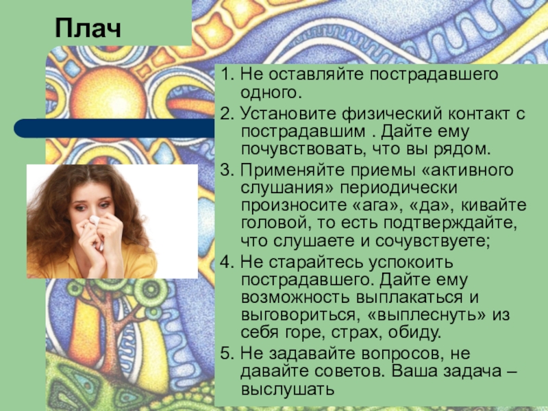 4. Не старайтесь успокоить пострадавшего. Дайте ему возможность выплакаться и выговориться, «выплеснуть» из себя горе, страх, обиду.