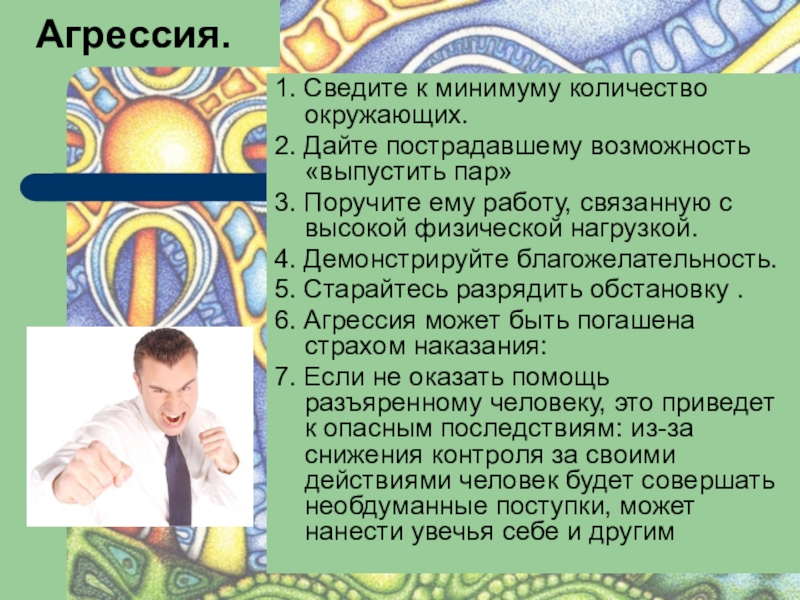 7. Если не оказать помощь разъяренному человеку, это приведет к опасным последствиям: из-за снижения контроля за своими действиями человек будет совершать необдуманные поступки, может нанести увечья себе и другим
