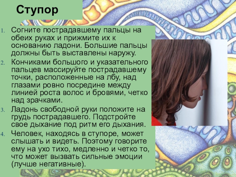 Человек, находясь в ступоре, может слышать и видеть. Поэтому говорите ему на ухо тихо, медленно и четко то, что может вызвать сильные эмоции (лучше негативные).