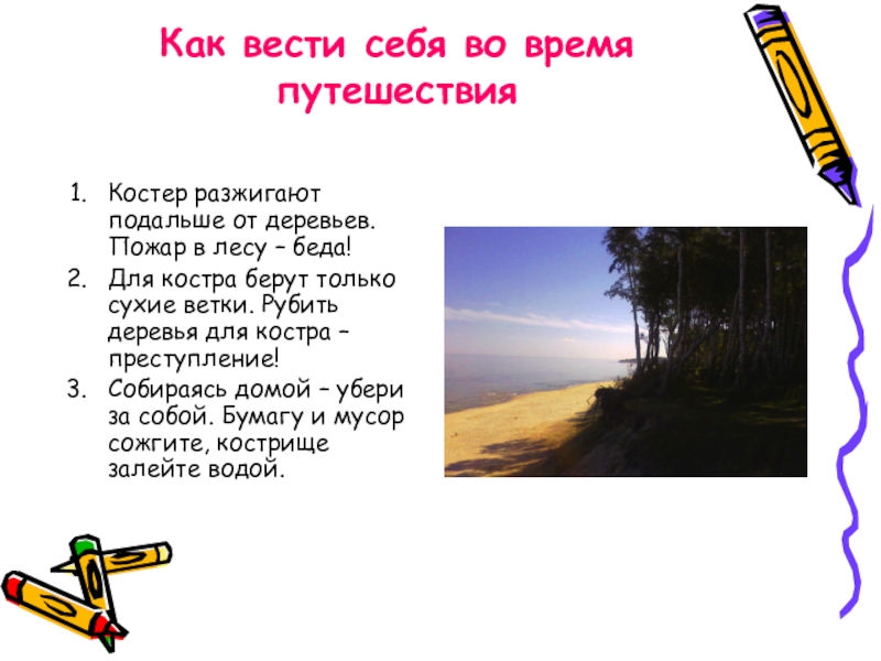Как вести себя во время путешествияКостер разжигают подальше от деревьев. Пожар в лесу – беда!Для костра берут