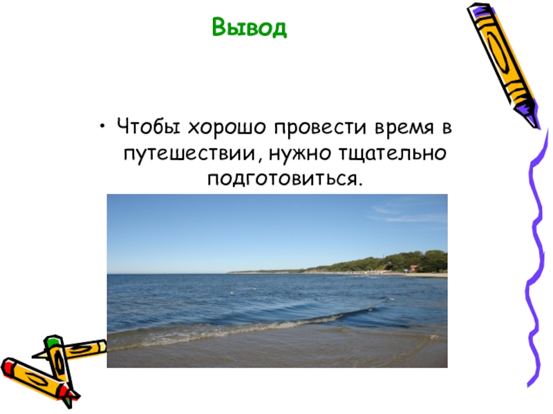 ВыводЧтобы хорошо провести время в путешествии, нужно тщательно подготовиться.