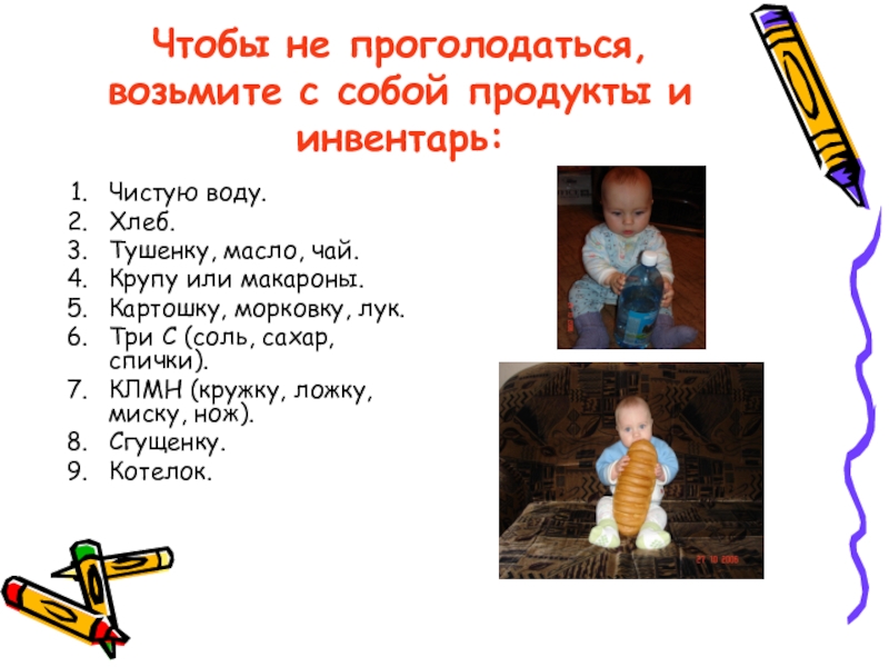 Слайд 4Чтобы не проголодаться, возьмите с собой продукты и инвентарь: