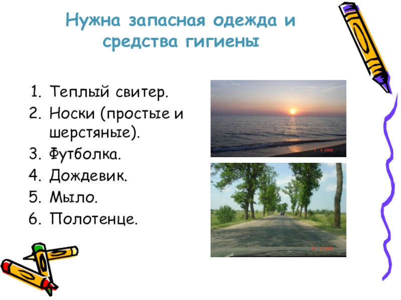 Нужна запасная одежда и средства гигиеныТеплый свитер.Носки (простые и шерстяные).Футболка.Дождевик.Мыло.Полотенце.