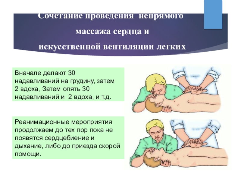 Реанимационные мероприятия продолжаем до тех пор пока не появятся сердцебиение и дыхание, либо до приезда скорой помощи.