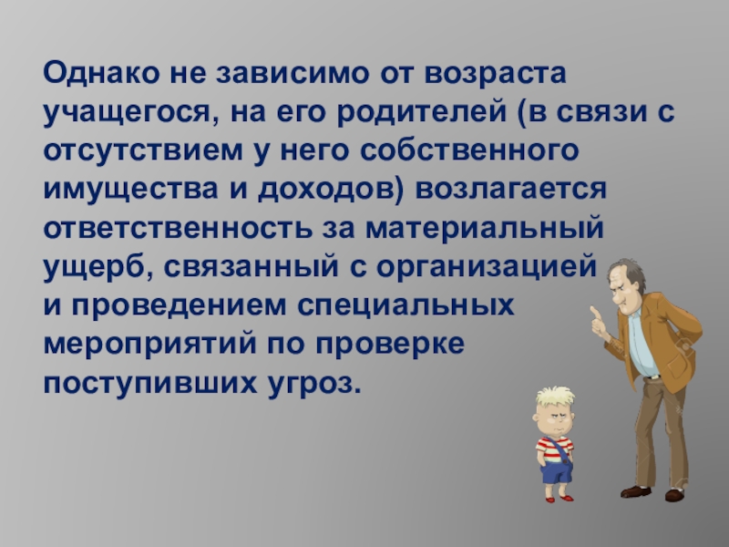 Слайд 12Ложное сообщение о террористическом акте также влечет за собой дезорганизацию образовательного