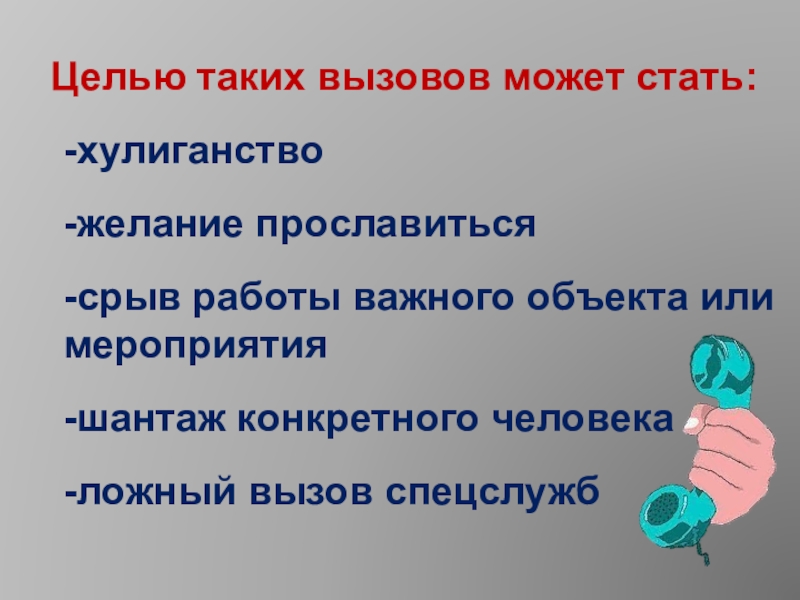 -ложный вызов спецслужбЦелью таких вызовов может стать: -хулиганство-желание прославиться-срыв работы важного объекта или мероприятия-шантаж конкретного человека
