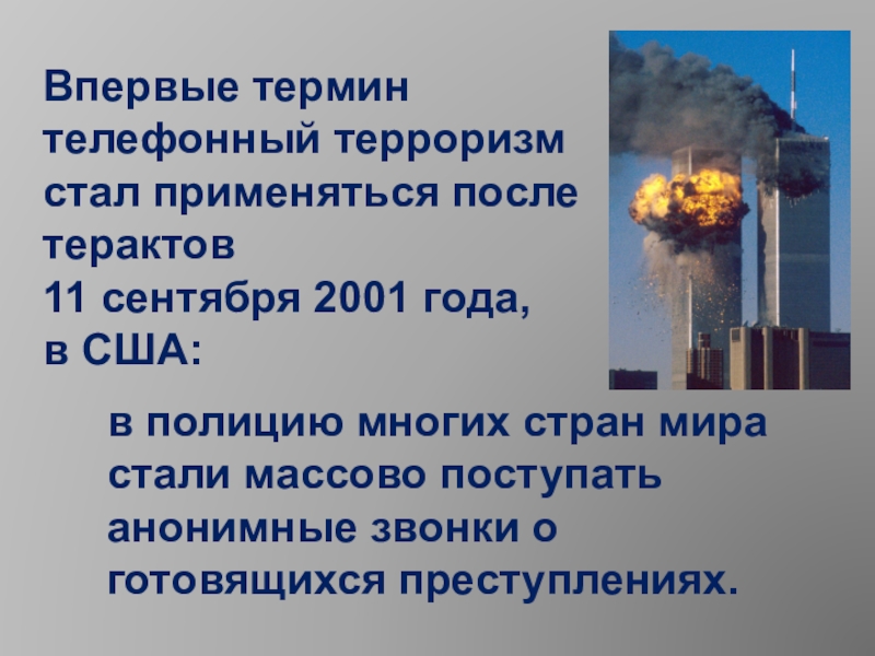 Слайд 2Впервые термин телефонный терроризм стал применяться после терактов