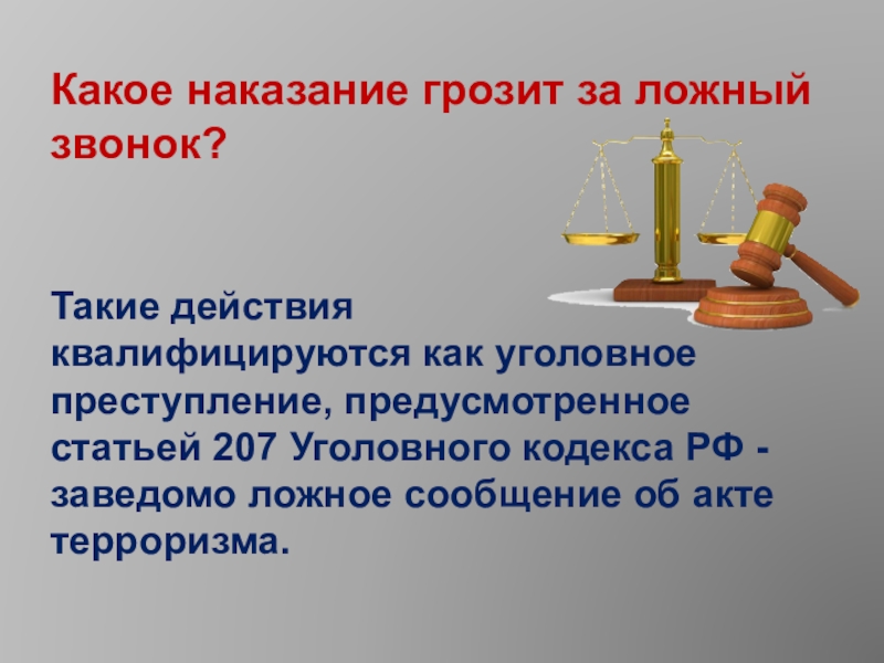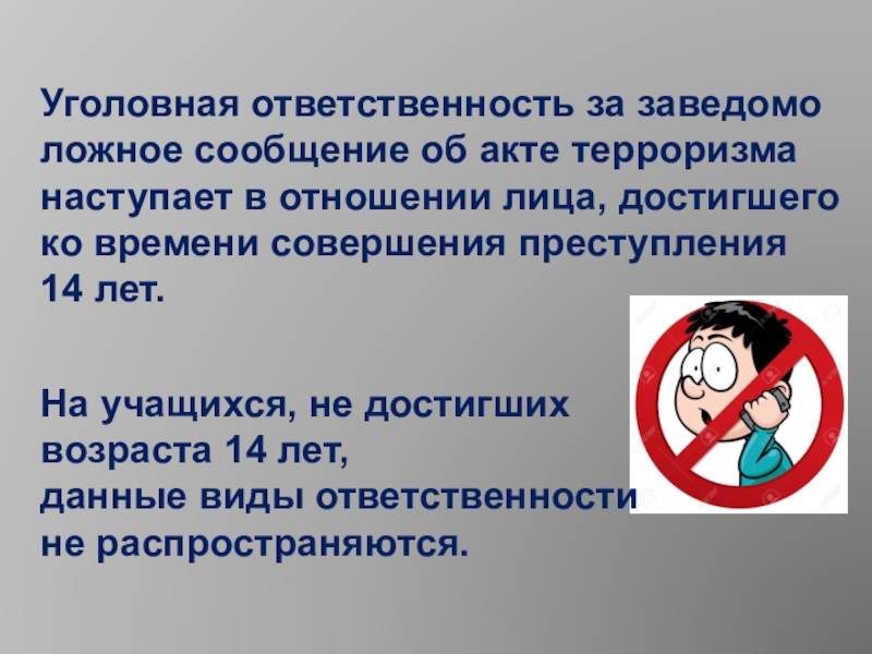 Слайд 10Уголовная ответственность за заведомо ложное сообщение об акте терроризма наступает в