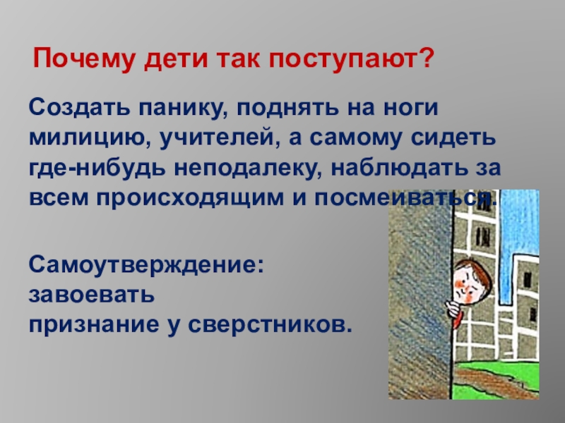 Почему дети так поступают?Создать панику, поднять на ноги милицию, учителей, а самому сидеть где-нибудь неподалеку, наблюдать за