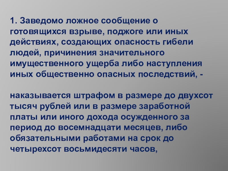 1. Заведомо ложное сообщение о готовящихся взрыве, поджоге или иных действиях, создающих опасность гибели людей, причинения значительного
