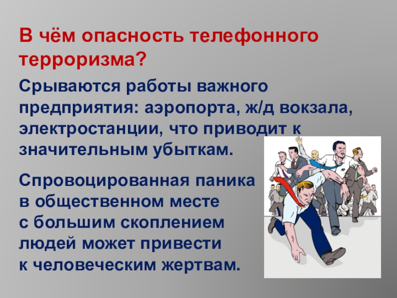 В чём опасность телефонного терроризма?Спровоцированная паника в общественном месте с большим скоплением людей может привести к человеческим