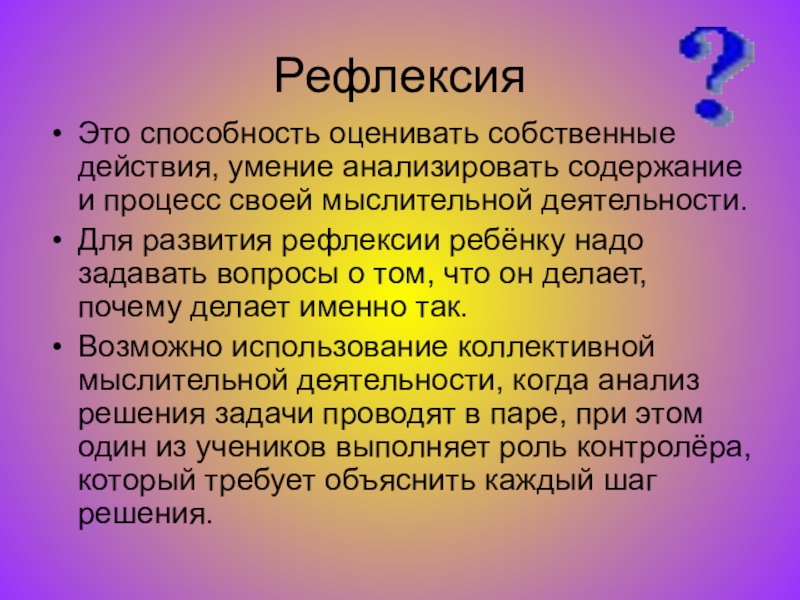 Для развития рефлексии ребёнку надо задавать вопросы о том, что он делает, почему делает именно так.