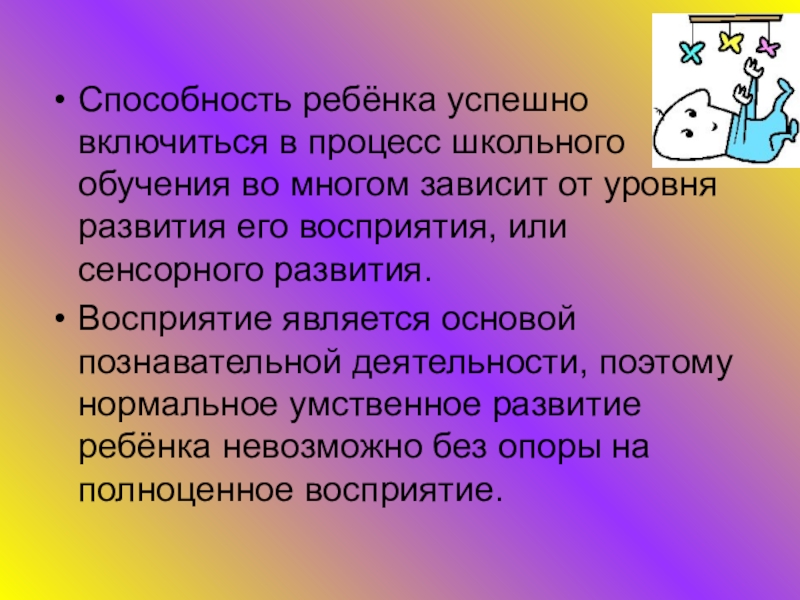 Восприятие является основой познавательной деятельности, поэтому нормальное умственное развитие ребёнка невозможно без опоры на полноценное восприятие.