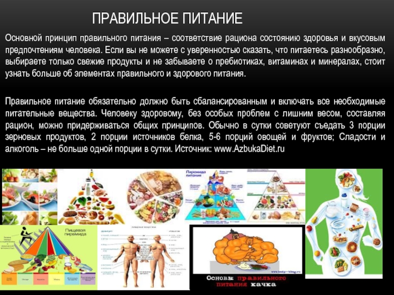Правильное питание обязательно должно быть сбалансированным и включать все необходимые питательные вещества. Человеку здоровому, без особых проблем с лишним весом, составляя рацион, можно придерживаться общих принципов. Обычно в сутки советуют съедать 3 порции зерновых продуктов, 2 порции источников белка, 5-6 порций овощей и фруктов; Сладости и алкоголь – не больше одной порции в сутки. Источник: www.AzbukaDiet.ru