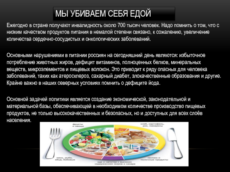 Основными нарушениями в питании россиян на сегодняшний день являются: избыточное потребление животных жиров, дефицит витаминов, полноценных белков, минеральных веществ, микроэлементов и пищевых волокон. Это приводит к ряду опасных для человека заболеваний, таких как атеросклероз, сахарный диабет, злокачественные образования и другие. Крайне важно в наших северных условиях помнить о дефиците йода.