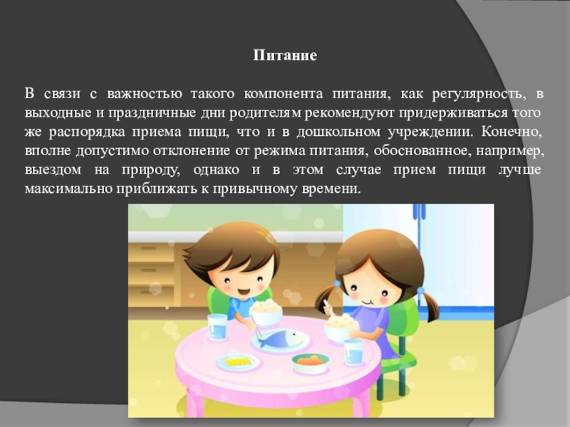и праздничные дни родителям рекомендуют придерживаться того же распорядка приема пищи, что и в дошкольном учреждении. Конечно, вполне допустимо отклонение от режима питания, обоснованное, например, выездом на природу, однако и в этом случае прием пищи лучше максимально приближать к привычному времени.