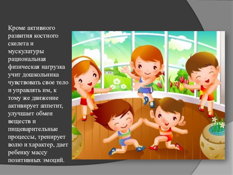 дошкольника чувствовать свое тело и управлять им, к тому же движение активирует аппетит, улучшает обмен веществ и пищеварительные процессы, тренирует волю и характер, дает ребенку массу позитивных эмоций.