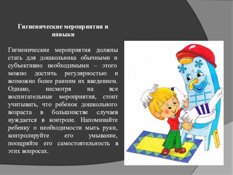 субъективно необходимыми – этого можно достичь регулярностью и возможно более ранним их введением. Однако, несмотря на все воспитательные мероприятия, стоит учитывать, что ребенок дошкольного возраста в большинстве случаев нуждается в контроле. Напоминайте ребенку о необходимости мыть руки, контролируйте его умывание, поощряйте его самостоятельность в этих вопросах.