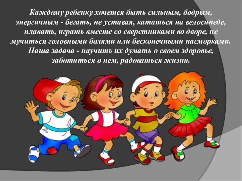 кататься на велосипеде, плавать, играть вместе со сверстниками во дворе, не мучиться головными болями или бесконечными насморками. Наша задача - научить их думать о своем здоровье, заботиться о нем, радоваться жизни.