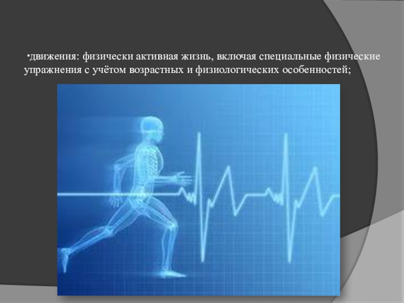 Слайд 10движения: физически активная жизнь, включая специальные физические упражнения с учётом возрастных