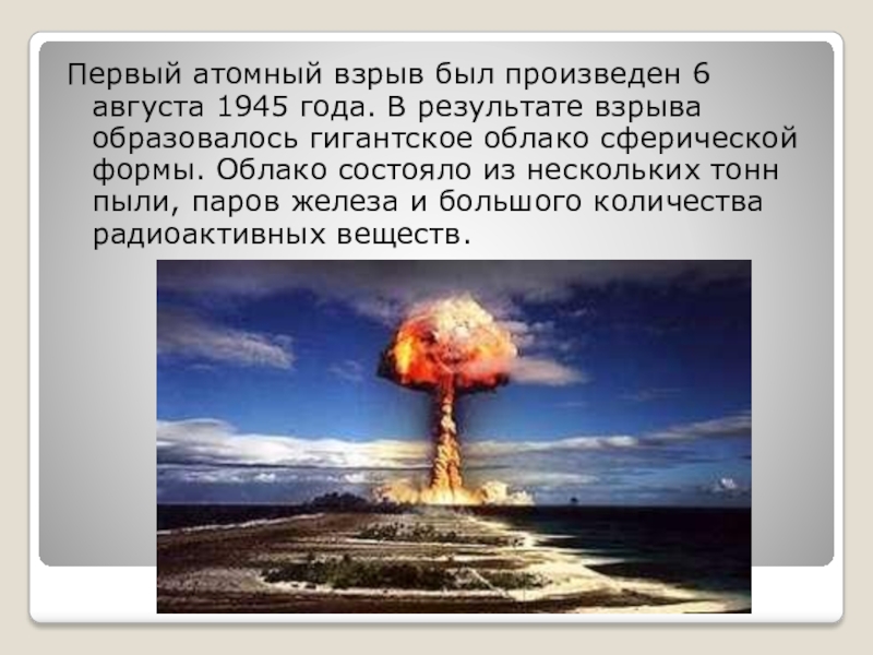Слайд 2Первый атомный взрыв был произведен 6 августа 1945 года. В результате