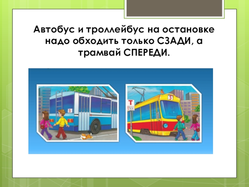 Слайд 16Автобус и троллейбус на остановке надо обходить только СЗАДИ, а трамвай