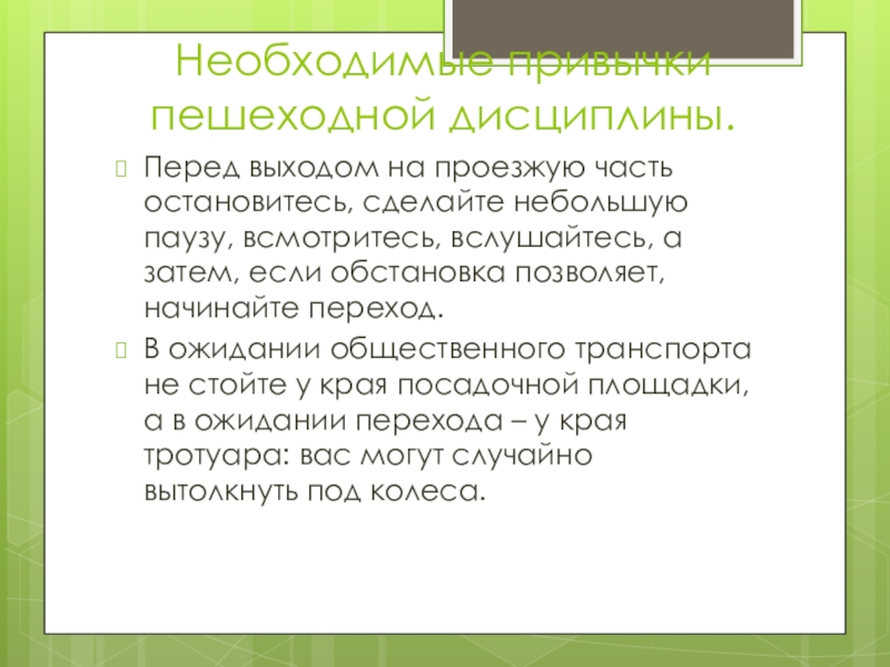 Слайд 11Необходимые привычки пешеходной дисциплины.