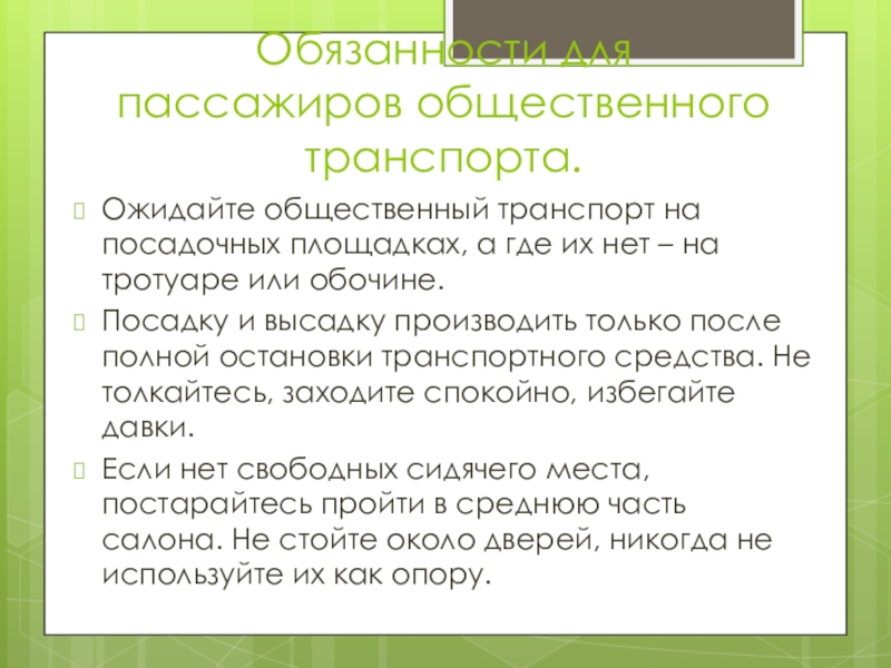 Слайд 13Обязанности для пассажиров общественного транспорта.