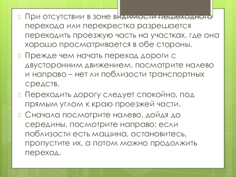 Слайд 10При отсутствии в зоне видимости пешеходного перехода или перекрестка разрешается переходить