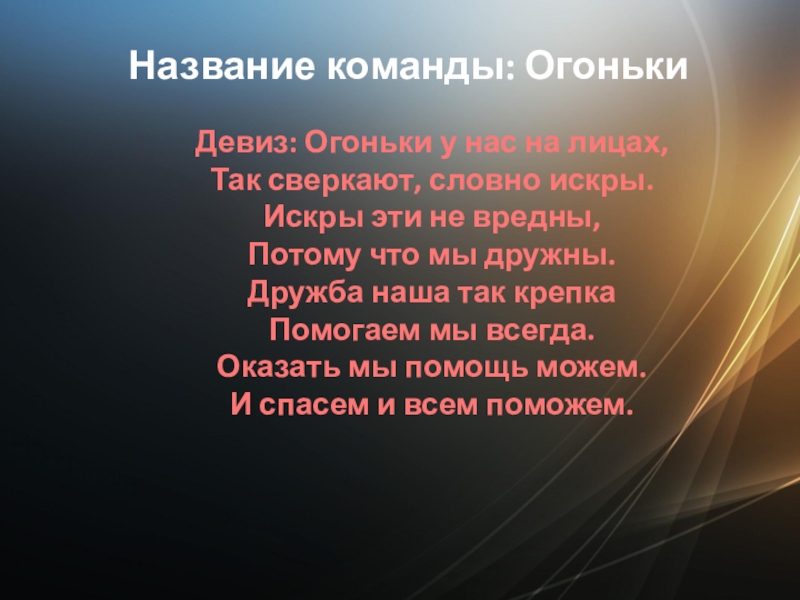 Название команды: ОгонькиДевиз: Огоньки у нас на лицах, Так сверкают, словно искры.Искры эти не вредны, Потому что мы дружны.Дружба наша так крепкаПомогаем мы всегда.Оказать мы помощь можем.И спасем и всем поможем.