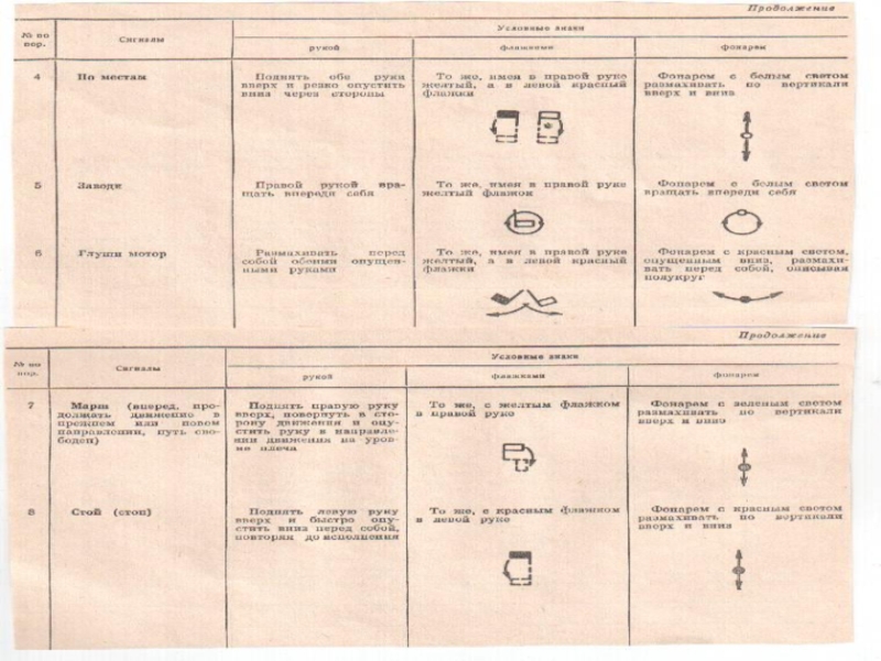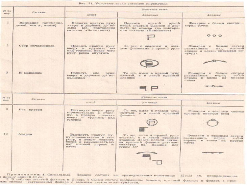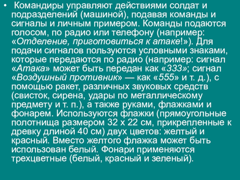 сигналы и личным примером. Команды подаются голосом, по радио или телефону (например: «Отделение, приготовиться к атаке!»). Для подачи сигналов пользуются условными знаками, которые передаются по радио (например: сигнал «Атака» может быть передан как «333»; сигнал «Воздушный противник» — как «555» и т. д.), с помощью ракет, различных звуковых средств (свисток, сирена, удары по металлическому предмету и т. п.), а также руками, флажками и фонарем. Используются флажки (прямоугольные полотнища размером 32 х 22 см, прикрепленные к древку длиной 40 см) двух цветов: желтый и красный. Вместо желтого флажка может быть использован белый. Фонари применяются трехцветные (белый, красный и зеленый).