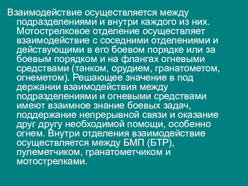 Взаимодействие осуществляется между подразделениями и внутри каждого из них. Мотострелковое отделение