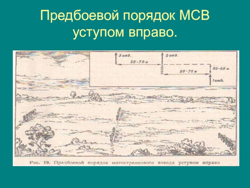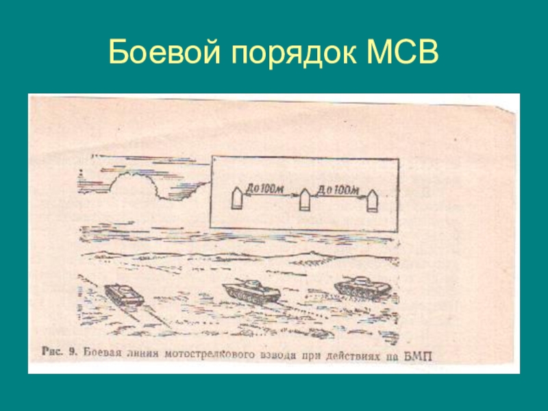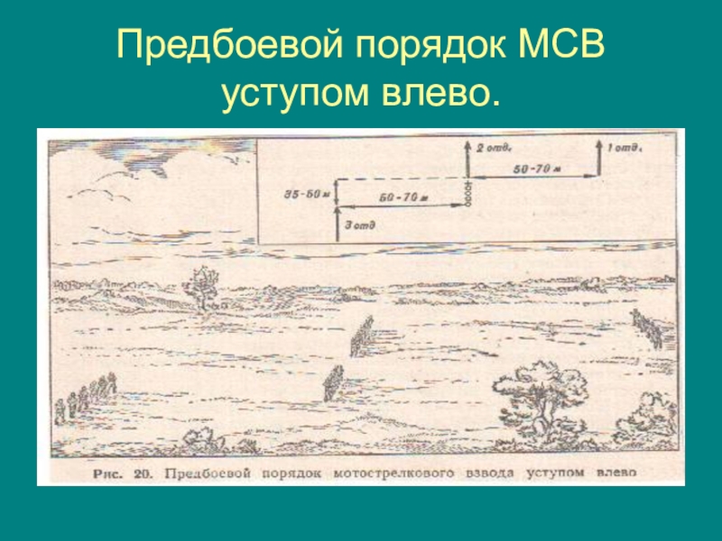 Слайд 7Предбоевой порядок МСВ уступом влево.