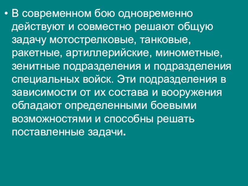 Слайд 17В современном бою одновременно действуют и совместно решают общую задачу мотострелковые,