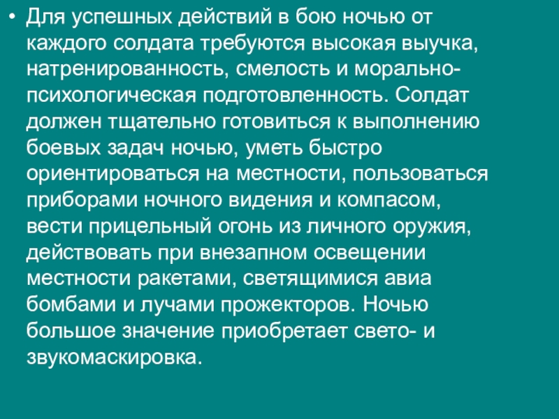 выучка, натренированность, смелость и морально-психологическая подготовленность. Солдат должен тщательно готовиться к выполнению боевых задач ночью, уметь быстро ориентироваться на местности, пользоваться приборами ночного видения и компасом, вести прицельный огонь из личного оружия, действовать при внезапном освещении местности ракетами, светящимися авиабомбами и лучами прожекторов. Ночью большое значение приобретает свето- и звукомаскировка.