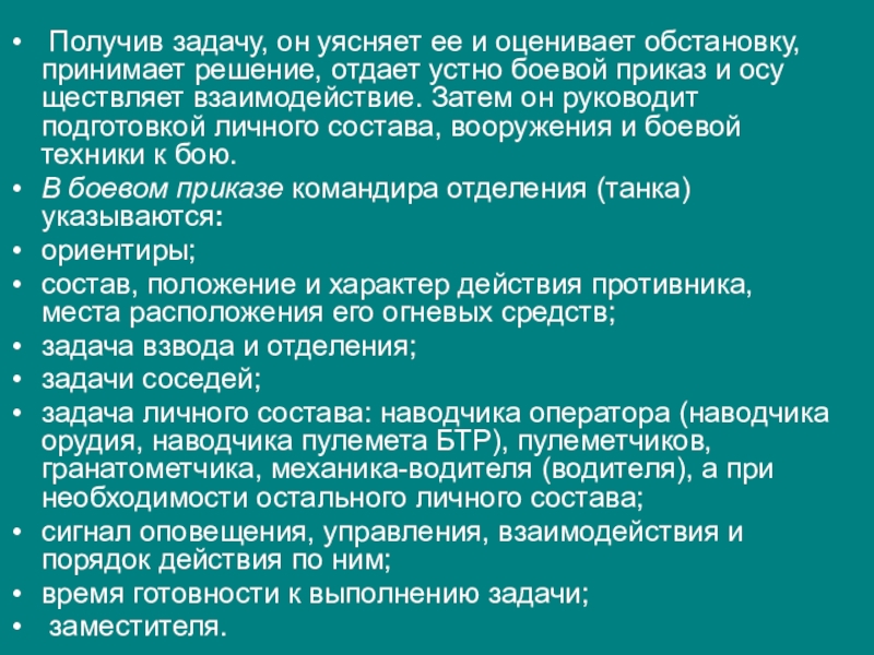 отдает устно боевой приказ и осуществляет взаимодействие. Затем он руководит подготовкой личного состава, вооружения и боевой техники к бою.