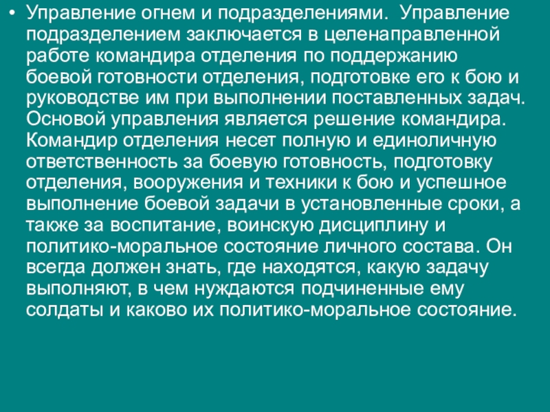 Слайд 20Управление огнем и подразделениями. Управление подразделением заключается в целенаправленной работе командира